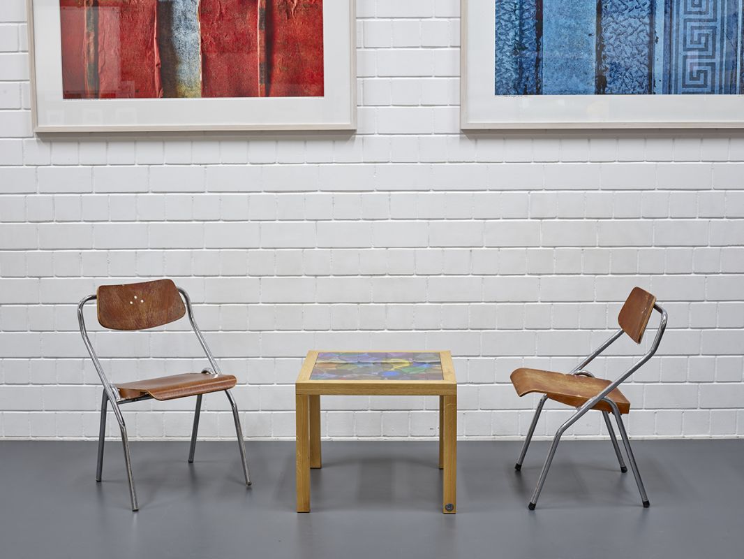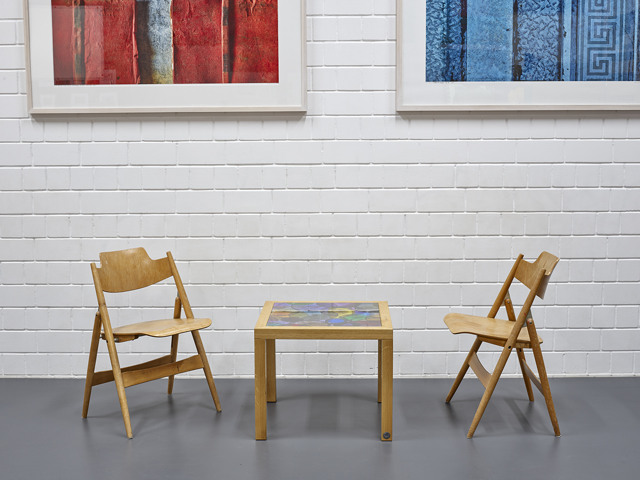 Klappstuhl von Erich Schelling, für Mauser-Werke, Waldeck, Deutschland, Entwurf von 1954, Konstruktionen mit Untergestell aus verchromtem Stahlrohr, Sitzfläche aufklappbar, Walnussfurnier, bezeichnet mit runden Herstellerplaketten.